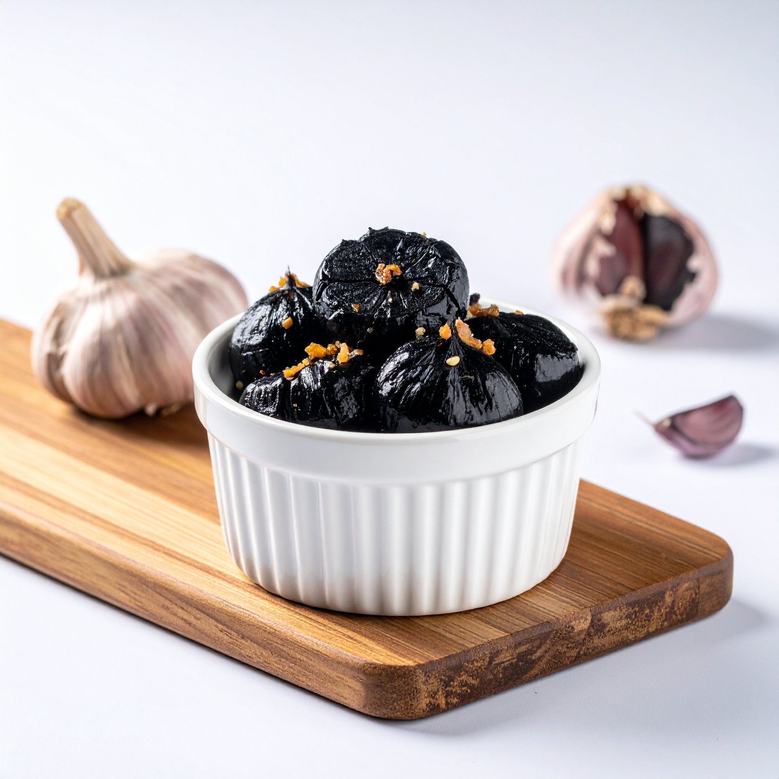 Ajo negro de sabor dulce y textura suave, excelente para recetas gourmet y aderezos.